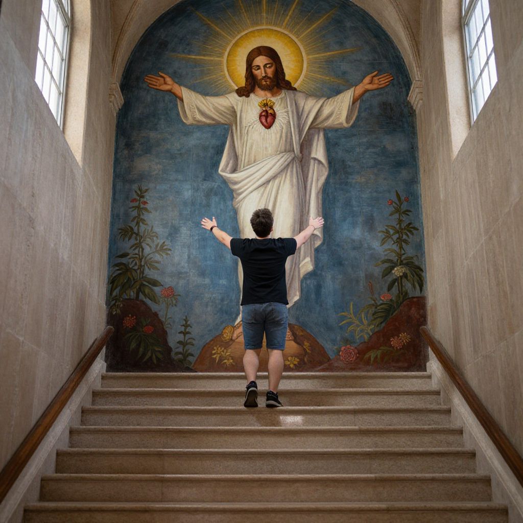 "Kawaii World man, climbing up, long stairway, Catholic art, Jesus, standing at the top of the stairway, looking down with outstretched arms, sacred heart of Jesus imagery,"