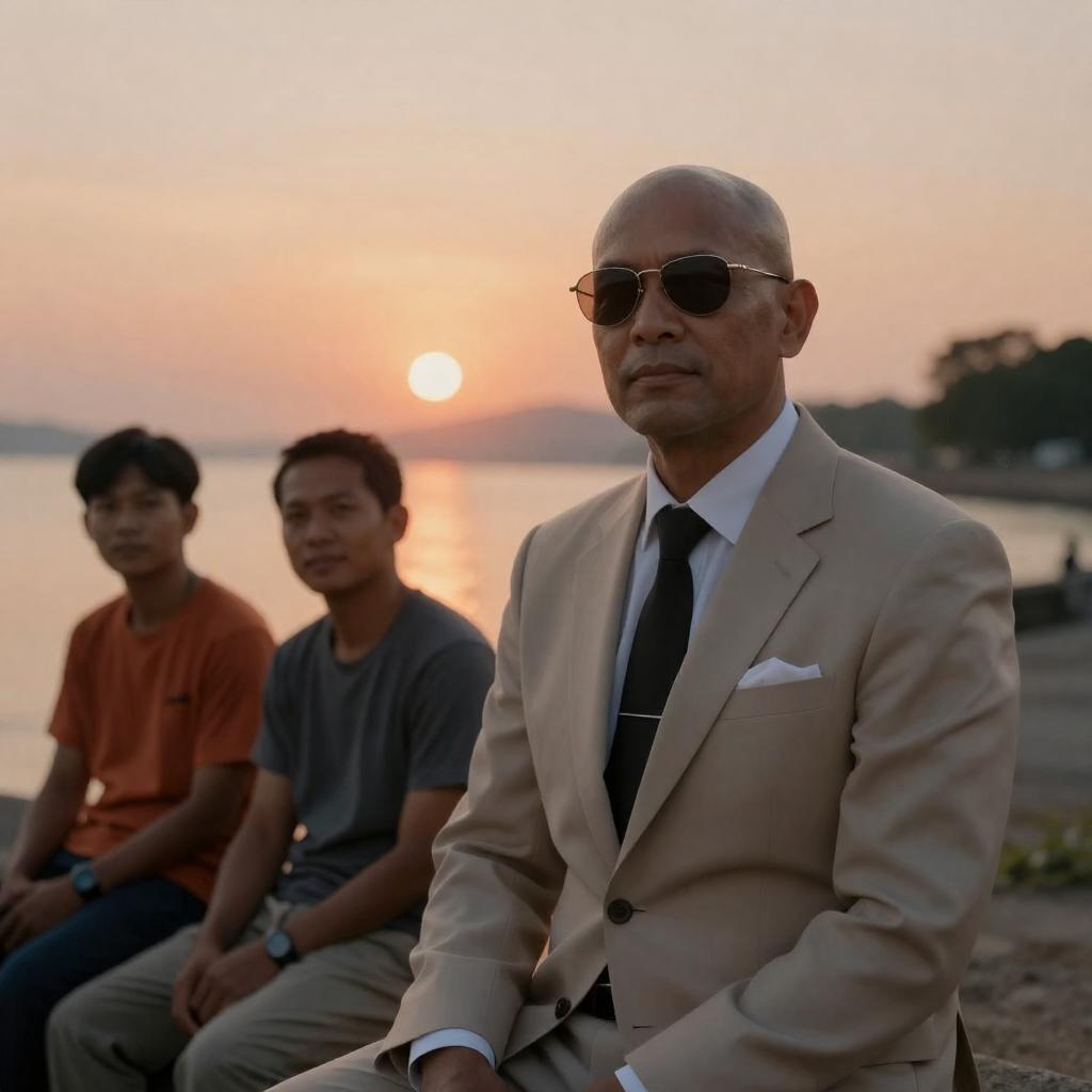 Photograph of three men at sunset. Foreground man, bald, wearing sunglasses, beige suit, white shirt, black tie, white pocket square, ring on right hand, sitting, looking forward. Background men, one in orange shirt, other in gray shirt, sitting behind. Sun low on horizon, orange sky, reflective water, distant trees, mountains. Foreground man in focus, background men slightly blurred.