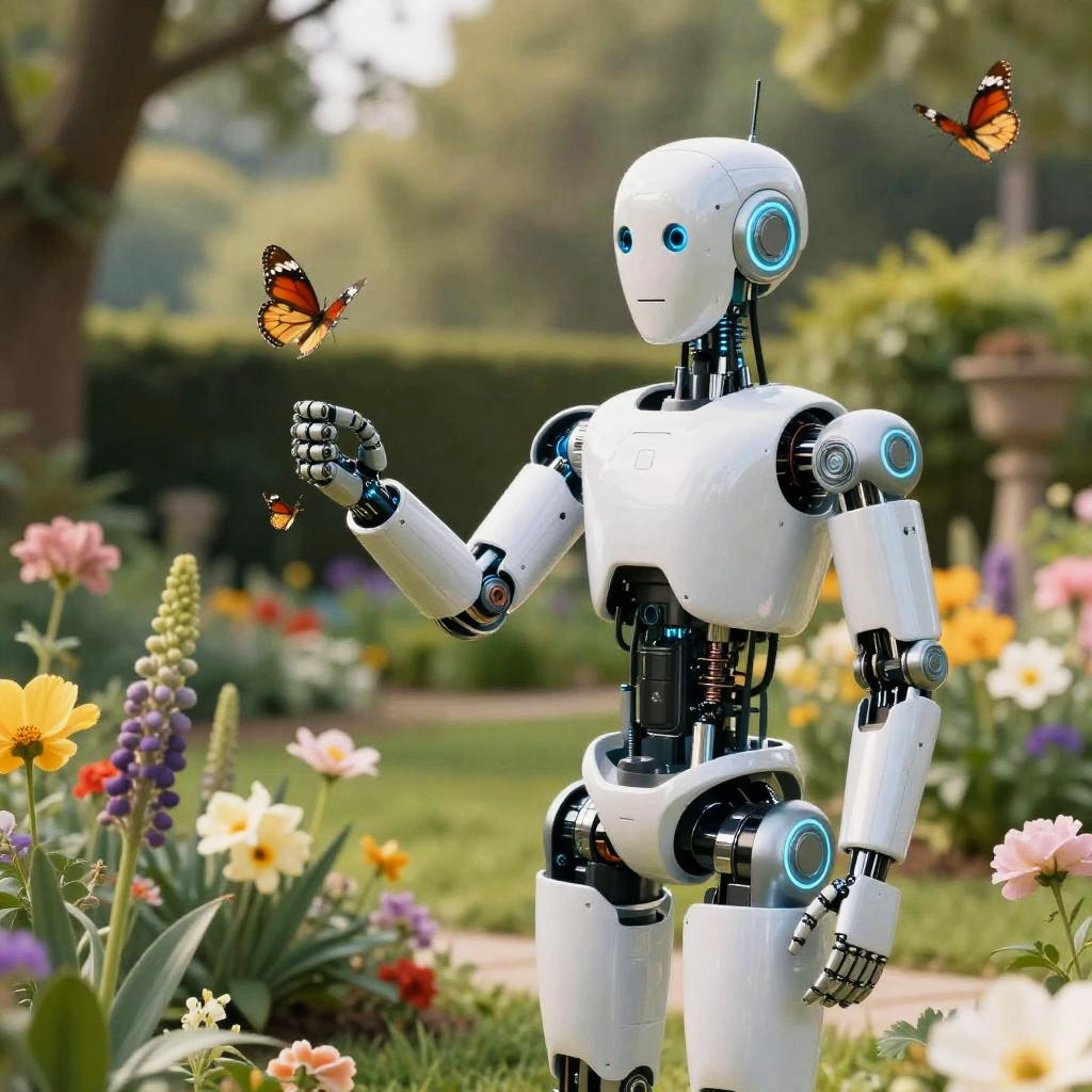 Huming robot delicately holding a delicate hummingbird, set in a dreamy meadow with wildflowers and a pastel sky, blending nature and technology elements, highly detailed and emotive composition.