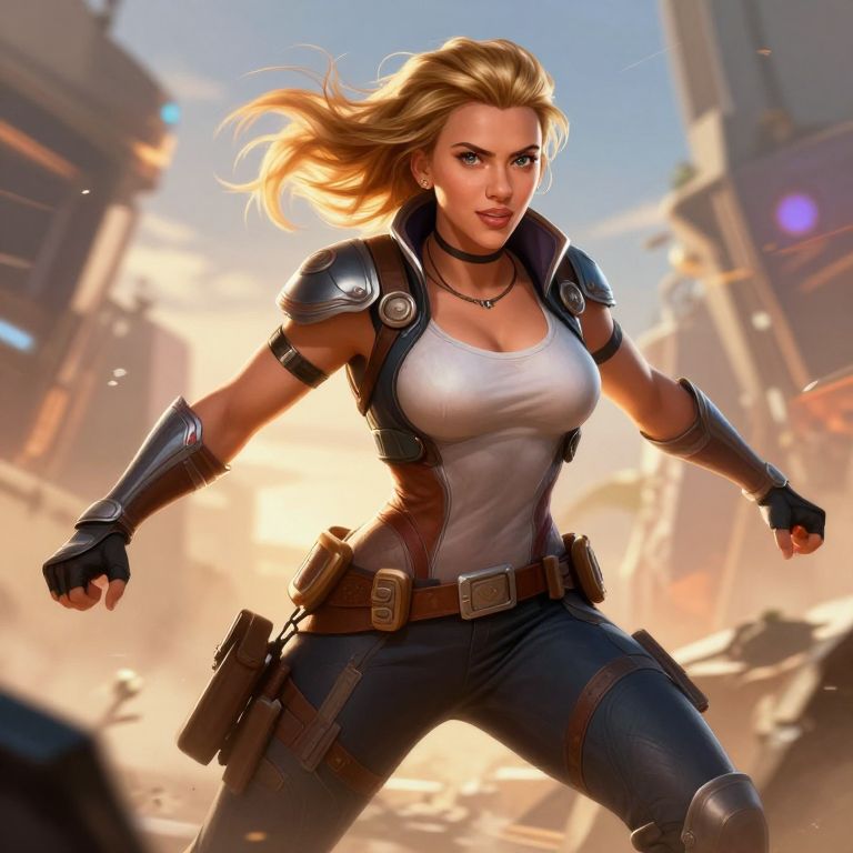 Digital artwork of a fierce, blonde, blue-eyed woman with a white tank top and black tactical gear, running through a sunlit, dusty, urban