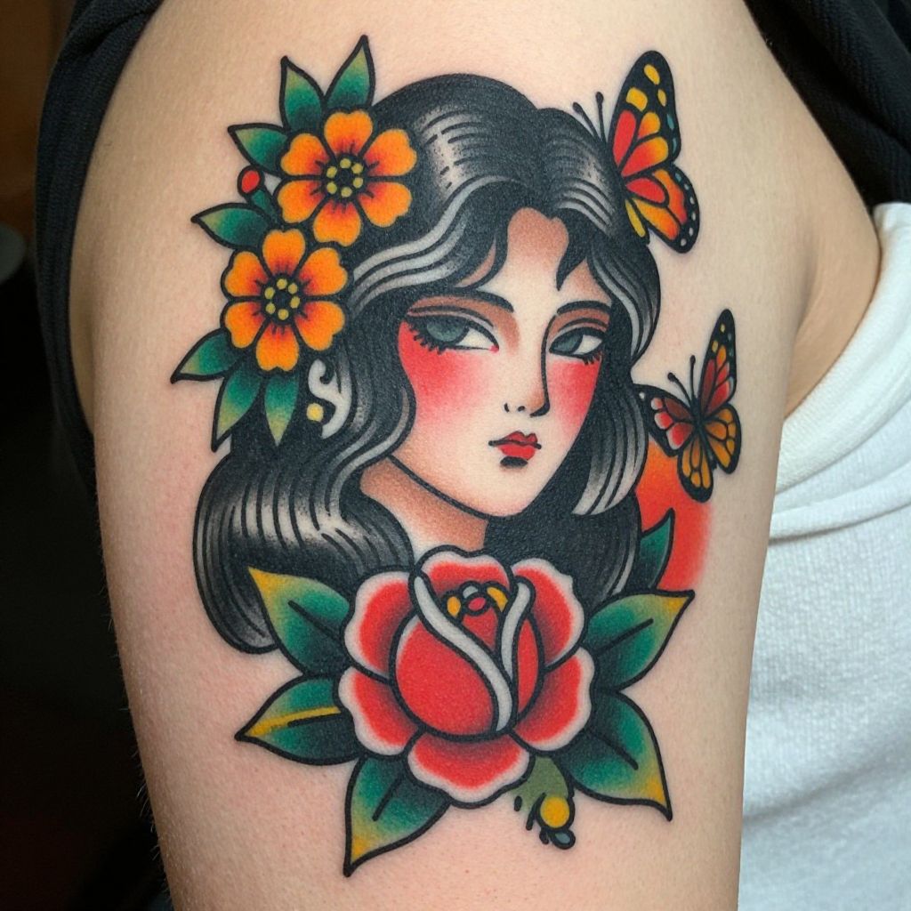 Photograph of a tattooed human thigh featuring a detailed, colorful skull with red roses, green leaves, and a beaded necklace.