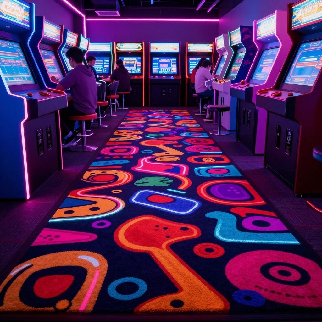 Neon arcade carpet featuring bold, colorful shapes and glowing outlines, inside a bustling neon-lit arcade room, saturated colors with a futuristic retro ambiance, hyper-realistic textures