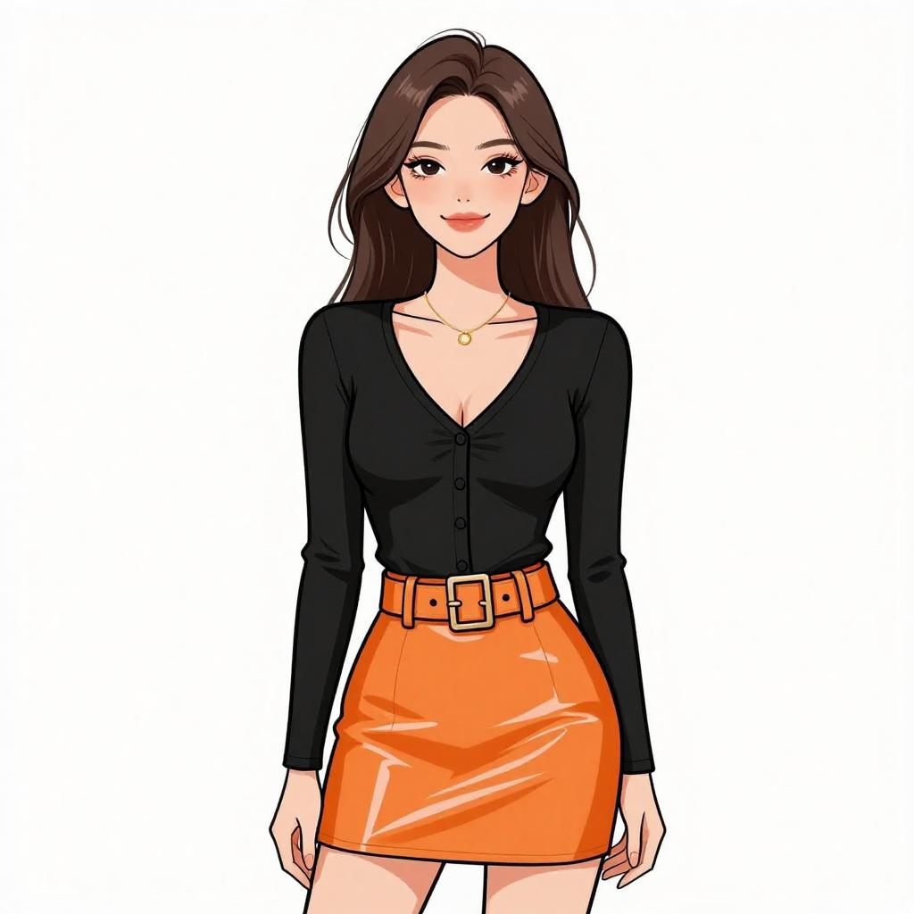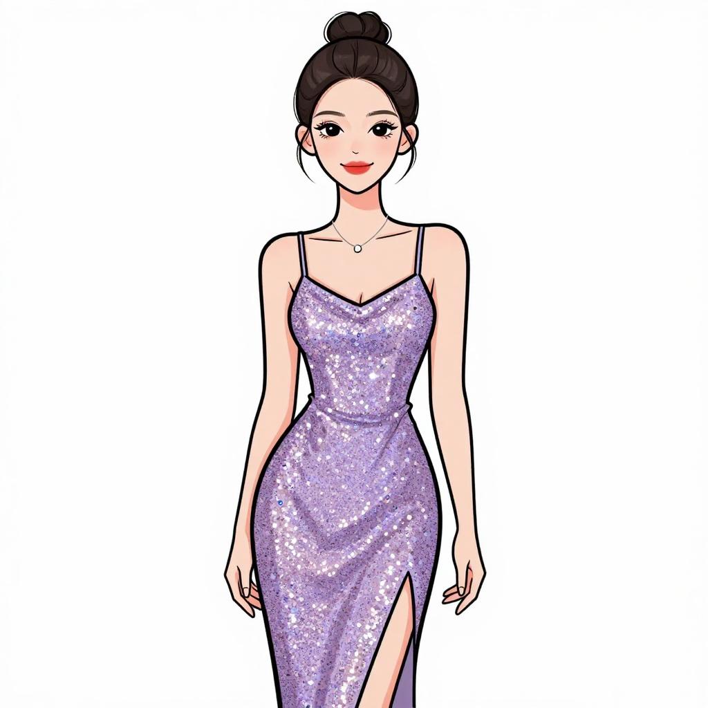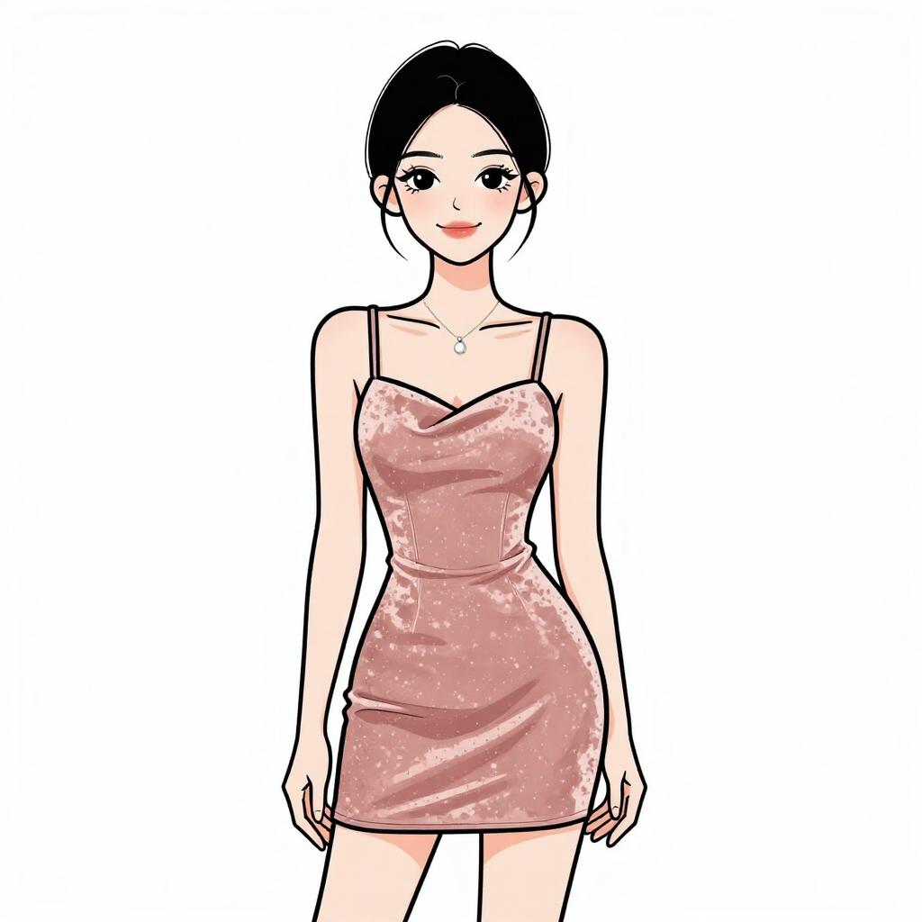 Digital illustration of a beautiful Asian woman with long black hair, wearing a shimmering, gold one-shoulder mini dress, smiling confidently against a white