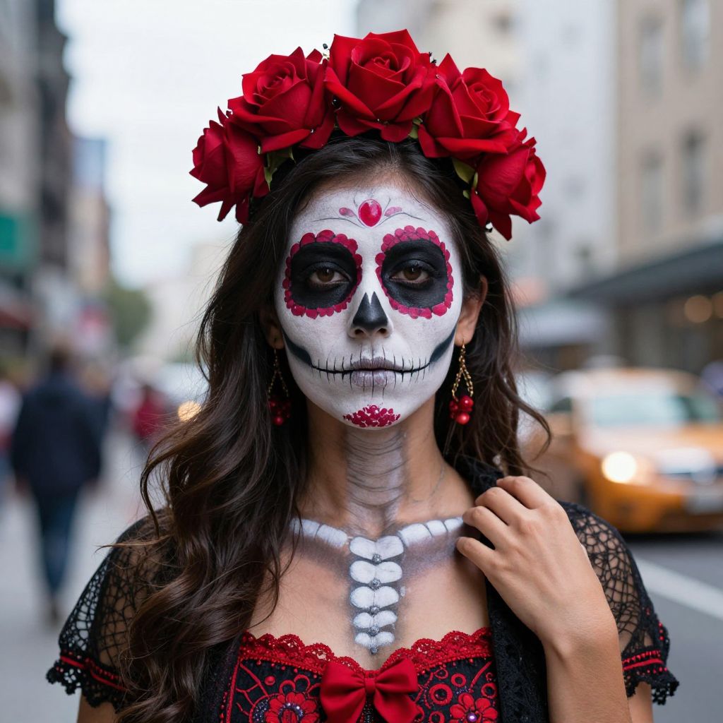 Embracing the duality of life and death, a woman adorned in vibrant Day of the Dead makeup and a crown of crimson roses stands as a poignant reminder of the cyclical nature of existence, her presence radiating both solemnity and celebration amidst the hum of urban life.