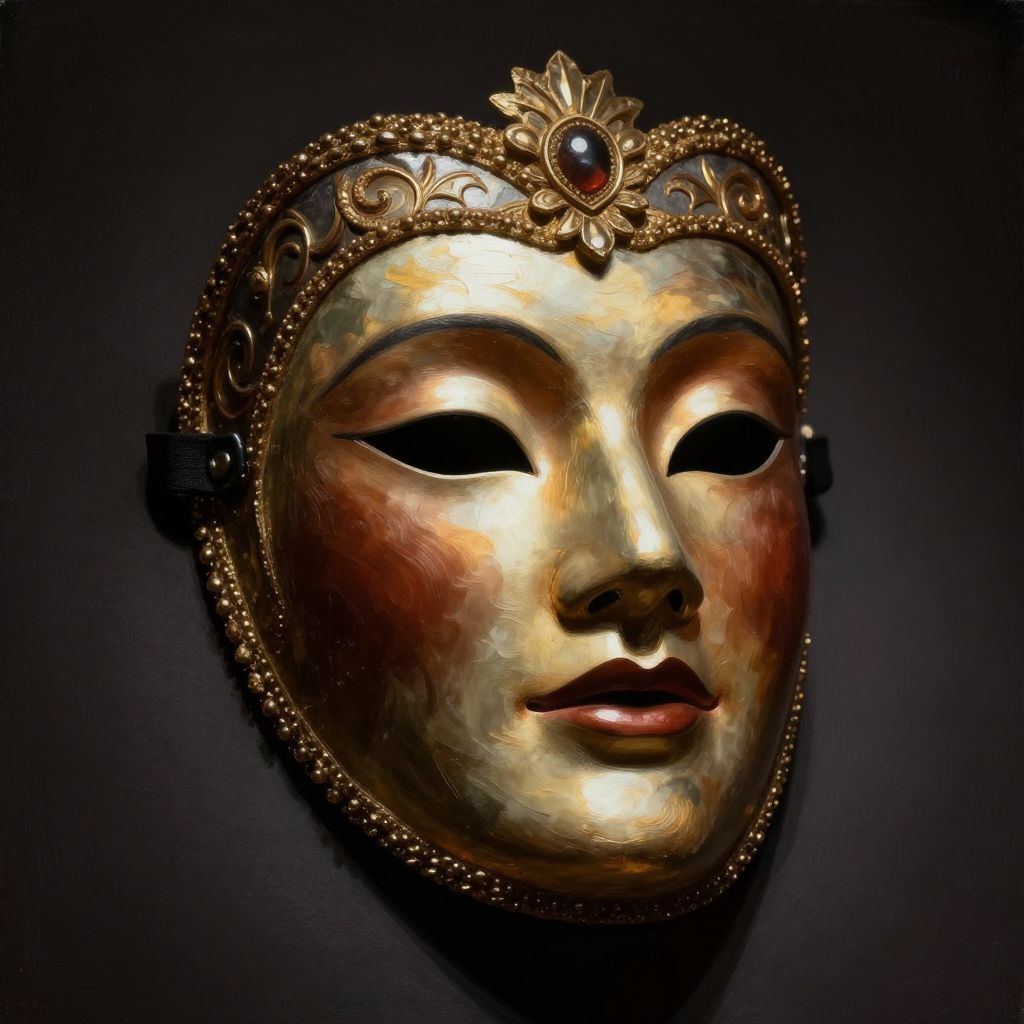 Face expression changer mask in a theatrical setting, ornate Venetian style with dynamic shifting facial features glowing softly, rich textures of fabrics and metal, dramatic spotlighting, surreal and mysterious mood, artistic digital painting