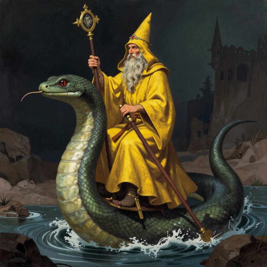 Digital illustration of an old wizard in a yellow robe and hat, riding a large, green snake with red eyes, in a dark, rocky, water