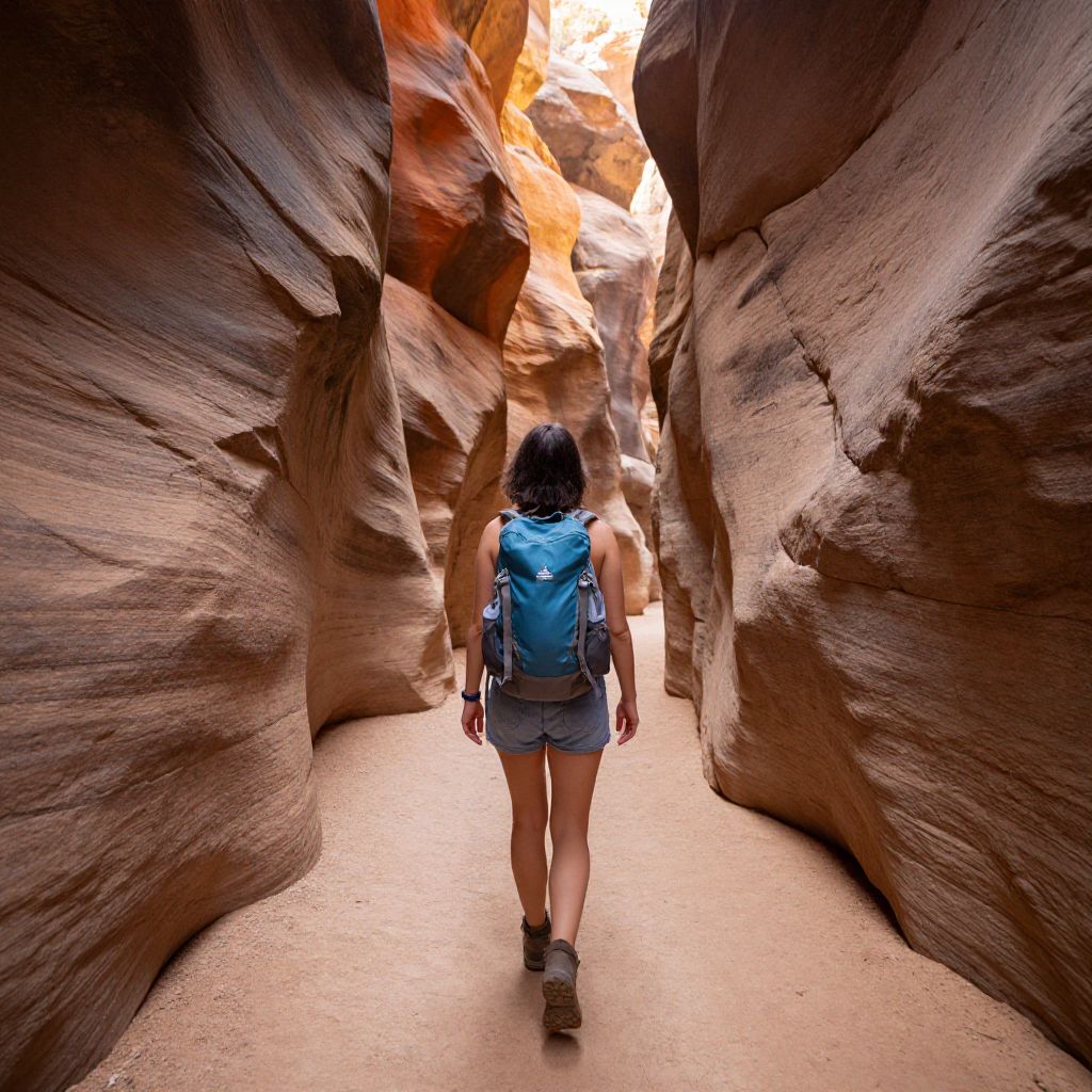 Photograph of a young woman with short black hair, wearing a blue backpack, gray tank top, and denim shorts, walking through a narrow, winding slot canyon with towering, curved, reddish-brown rock walls. The canyon floor is sandy, and sunlight filters in from the top, illuminating the rock formations. The woman's back is to the camera, and she is centered in the frame. The texture of the rocks is smooth yet rugged, with natural layers and striations. The overall scene conveys a sense of adventure and natural beauty.