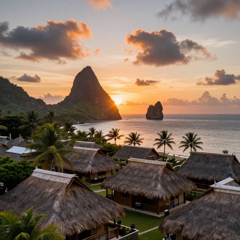 A picturesque coastal village with thatched roofs, palm trees, and a stunning sunset over the ocean with tall rock formations and clouds in the background.