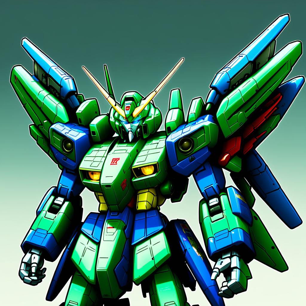 Stylized anime illustration of a green and blue Gundam mobile suit with glowing eyes, V-fin antennae, and detailed mecha armor, inspired by artist Shibacha's aesthetic.