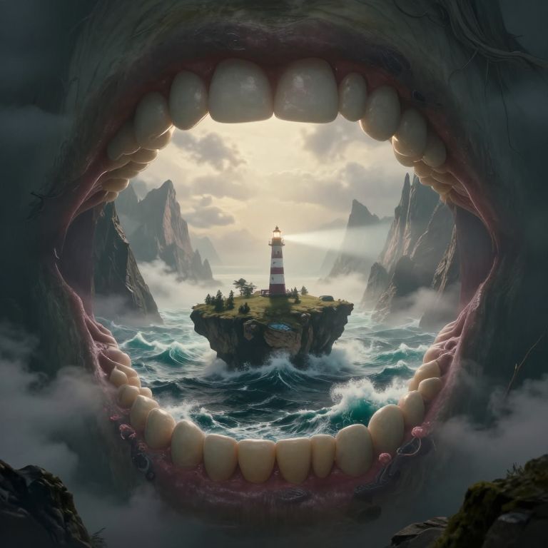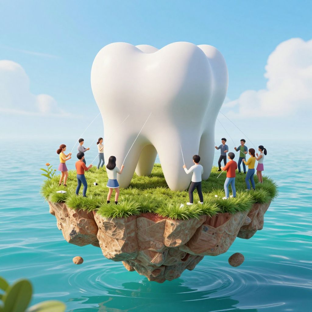 A surreal 3D-rendered scene depicts a floating island shaped like a giant human tooth, where a vibrant society of people engages in synchronized dental floss routines, set against a serene backdrop of turquoise waters and a clear sky, blending whimsical fantasy with hyper-realistic visual effects.