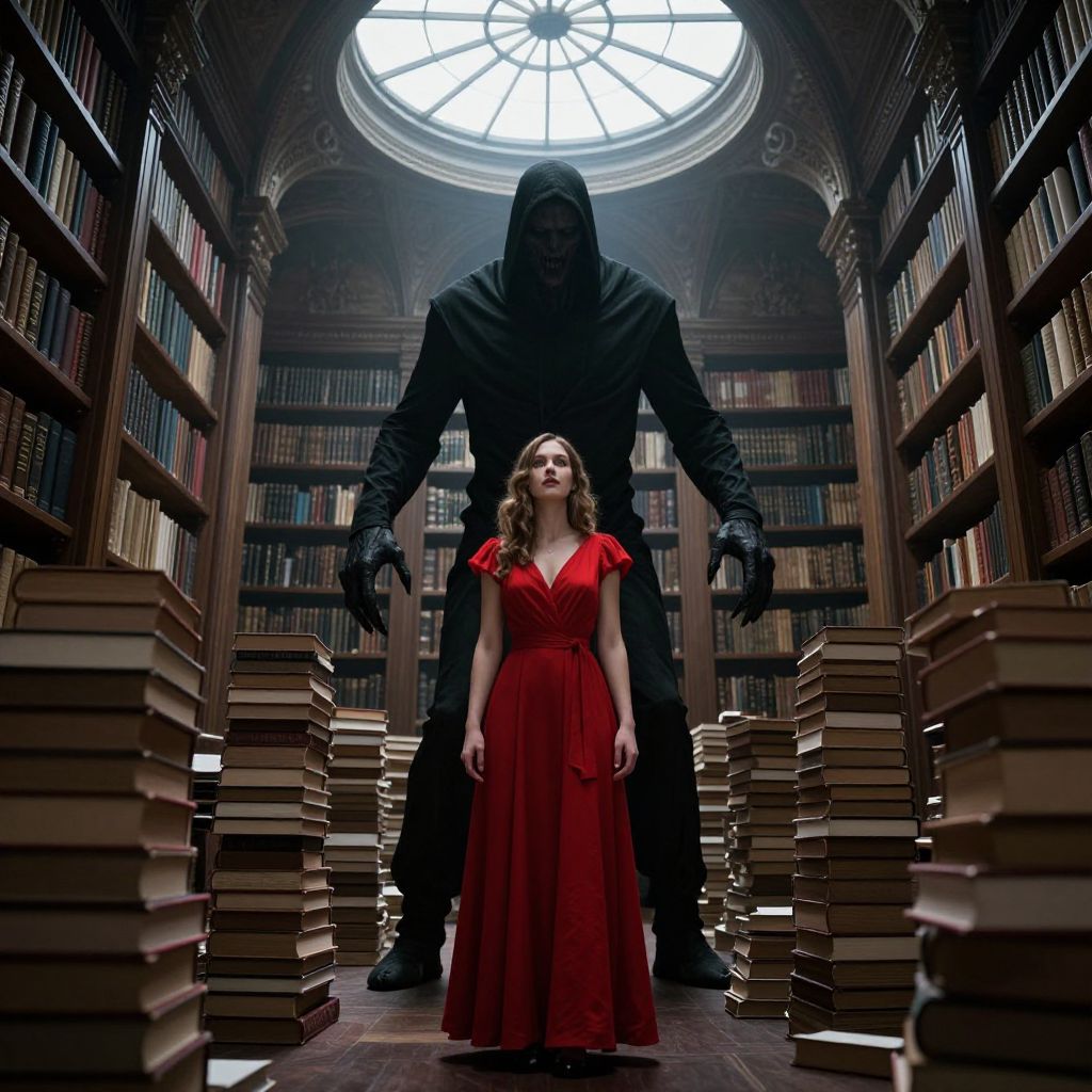 Photograph of a dimly lit library with high, arched ceilings and a large circular window at the center. A tall, shadowy figure in a black, hooded cloak stands menacingly behind a woman with fair skin and wavy brown hair, wearing a vivid red, V-neck, short-sleeved dress. Stacks of books surround them, creating a narrow path. The library's wooden shelves are filled with books, and the light from the circular window casts an eerie glow, highlighting the contrast between the dark figure and the bright dress. The scene is dramatic and suspenseful.