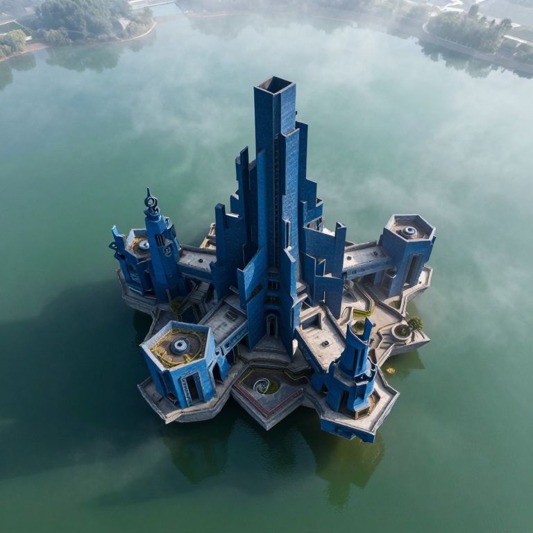 A surreal digital artwork showcases an awe-inspiring architectural marvel emerging from a serene lake veiled in ethereal mists. The structure boasts intricate, defying-gravity components reminiscent of floating geometrical shapes and warped forms. Captured from an aerial perspective, this captivating interplay between the building's complex design and the tranquil water creates a striking visual contrast. A harmonious blend of deep azure hues and soft emerald greens envelops the scene, evoking a sense of intrigue and serenity.