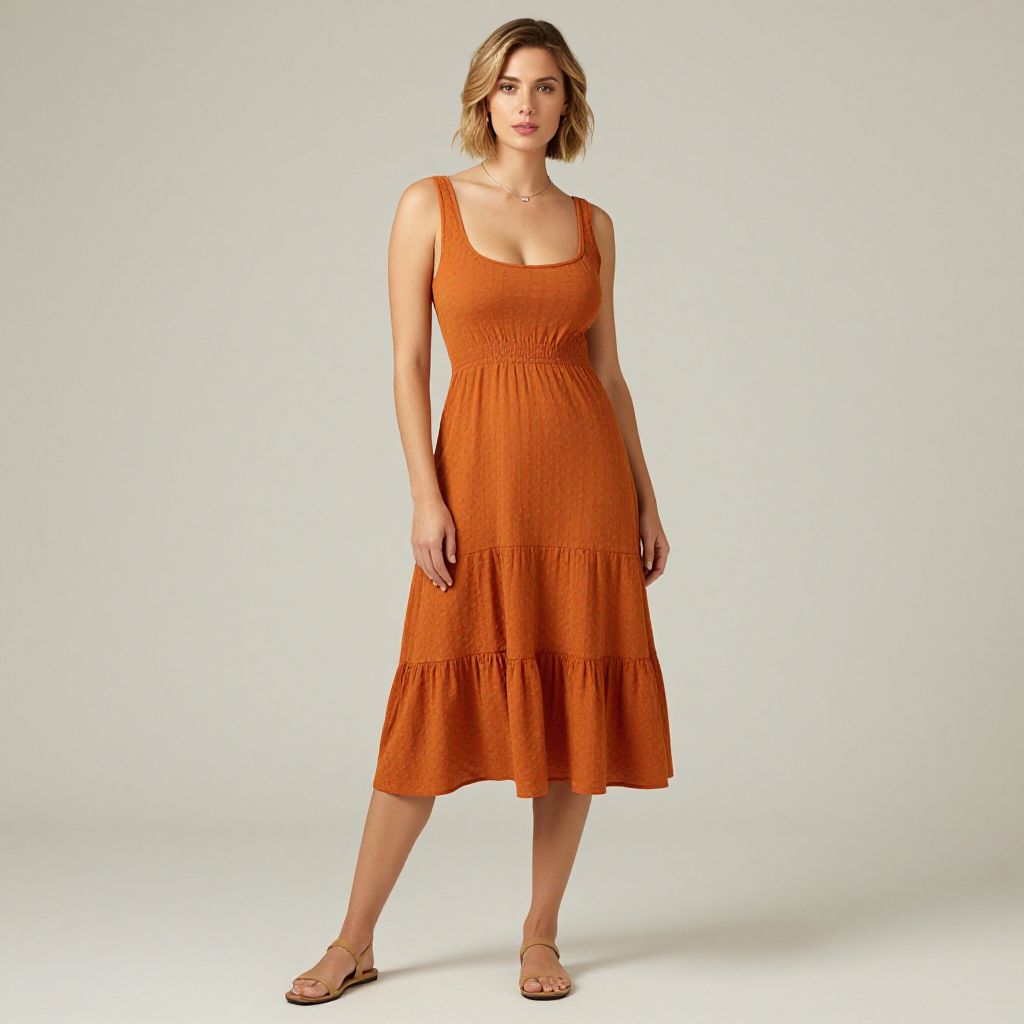 "Woman, casual summer, sleeveless midi dress in burnt orange, fitted bodice, scooped neckline, full skirt with a subtle flared hem, textured fabric, tan strappy flat sandals, minimal jewelry, short blonde hair, simple studio background. Sexy. Pretty face and beаutiful eyes. Big breasts."