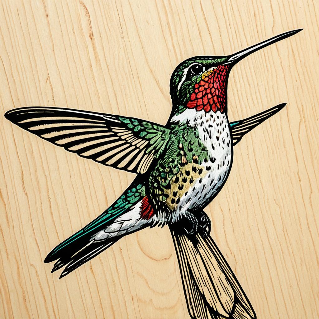 Happy hummingbird, full body portrait, woodcut, illustration, vibrant, sharp focus, beautifully detailed, rule of thirds, by Irving Amen