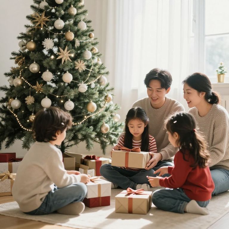 Photograph of an Asian family with three children sitting around a decorated Christmas tree, opening gifts in a sunlit room.