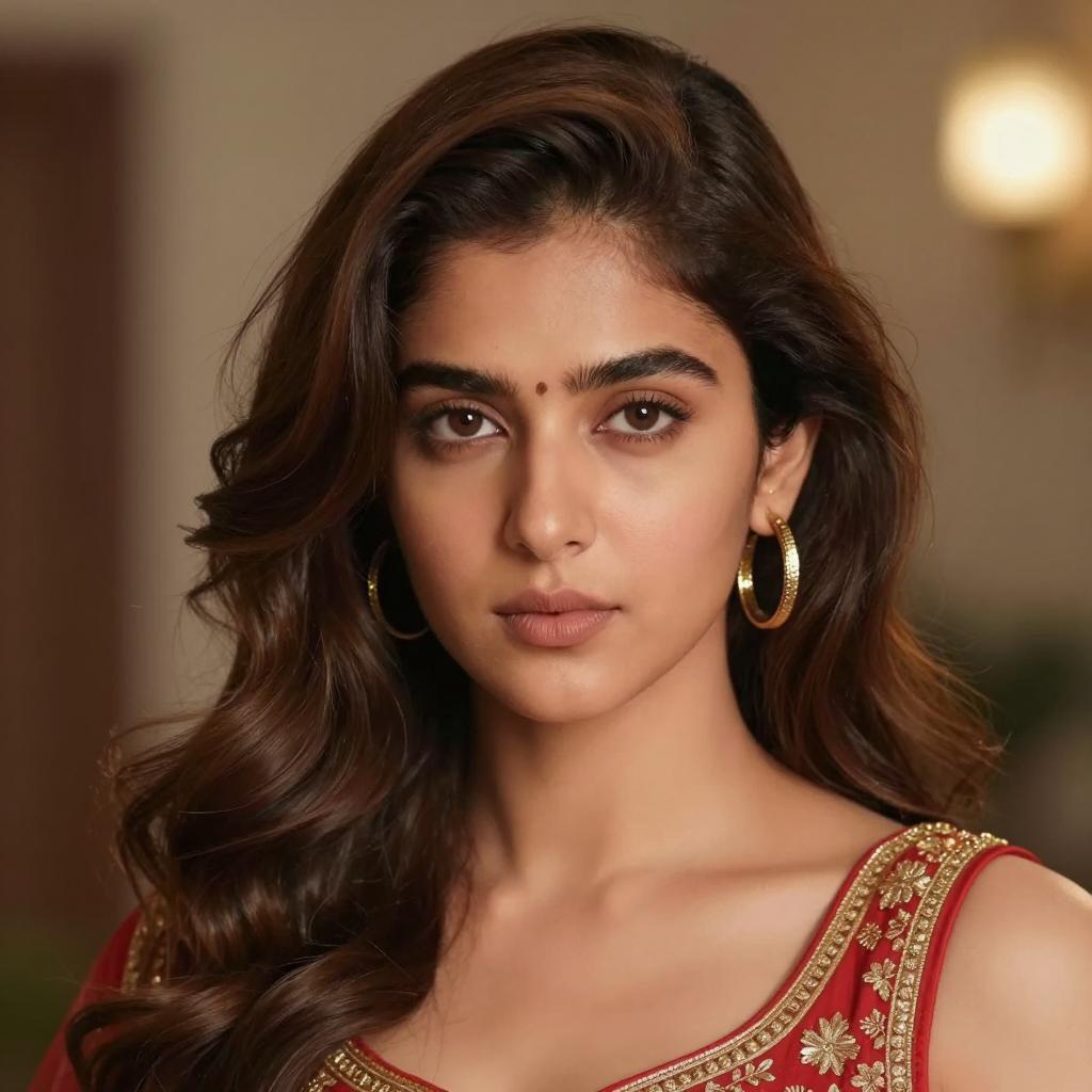 Party wear glitter, photograph of a beautiful Indian woman, long wavy brown hair, wearing a shimmering gold blouse and black high-waisted pants, black sheer dupatta, large silver earrings, intricate silver necklace, smiling, elegant, gold bracelet on right wrist, red flowers in background, blurred other women in background, indoor setting, warm lighting, soft focus, elegant attire, traditional jewelry, stylish, confident expression, high fashion, colorful and detailed background, upscale event, well-dressed, feminine, sophisticated, portrait style, high quality, realistic, polished look