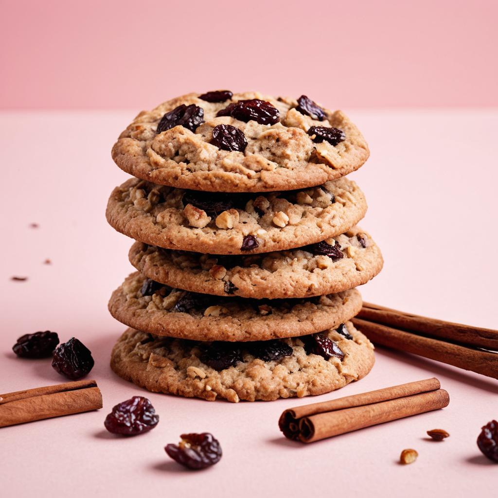 A hyper-realistic stack of oatmeal raisin cookies, surrounded by cinnamon sticks and scattered raisins. Pink pastel background, product photography style, ultra-detailed and mouthwatering