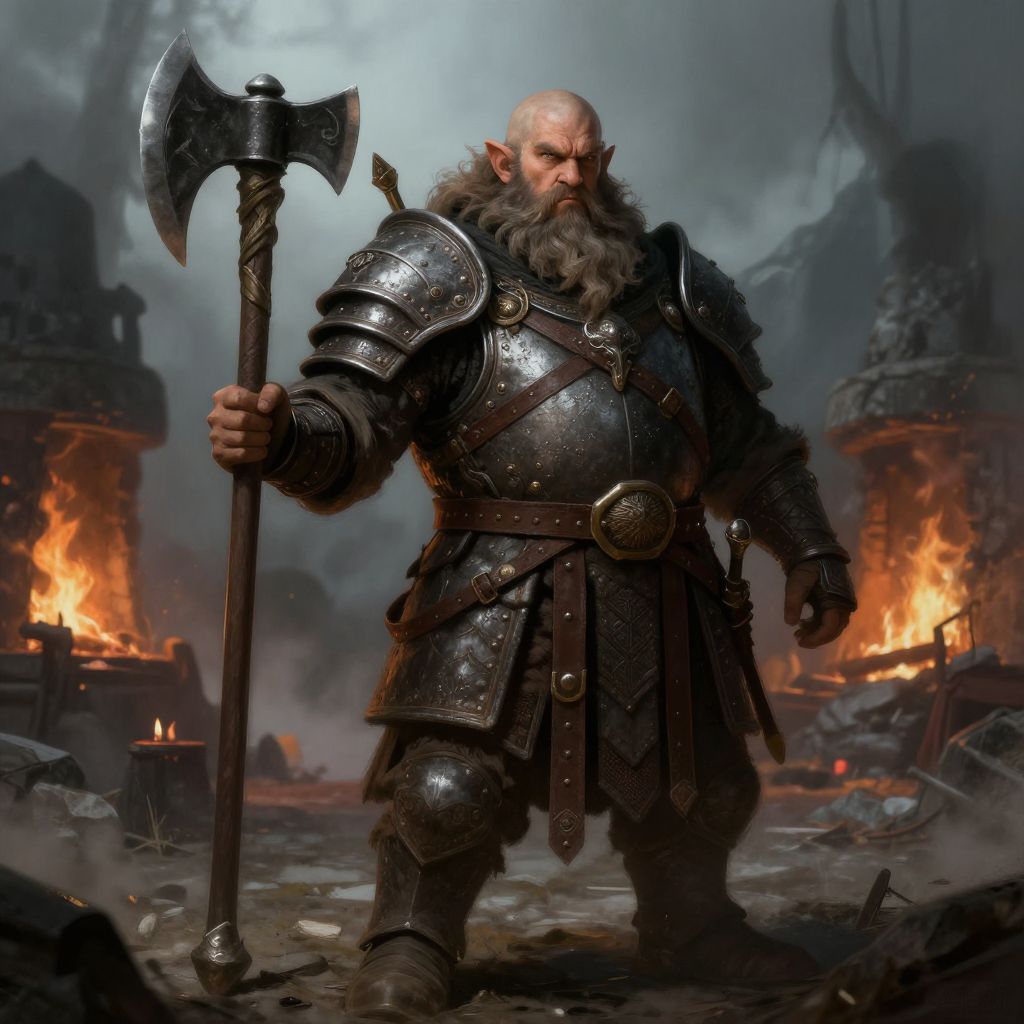 Dwarf character art featuring a stout, bearded warrior clad in intricate medieval armor, holding a battle axe, standing in a misty mountain forge, with detailed textures and dramatic lighting, fantasy style digital painting.