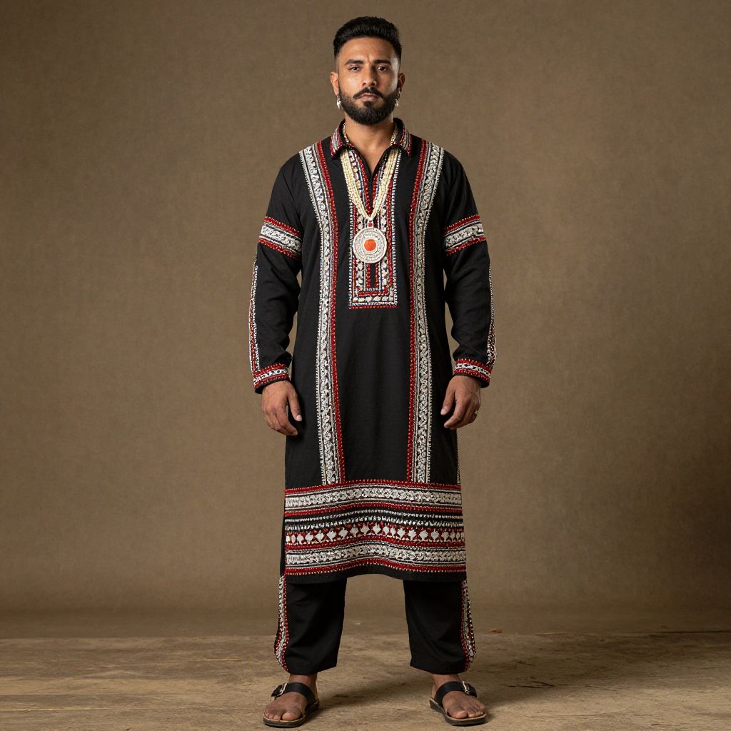 Photograph of a bearded South Asian man with short black hair and a medium build, standing against a plain brown backdrop. He wears a traditional black kurta with intricate white and red embroidery along the edges, sleeves, and front panel, and black pants with similar embroidery at the bottom. He has a confident expression and stands with his hands by his sides. He is barefoot, wearing only black sandals. The lighting is even, highlighting the detailed embroidery on his attire.