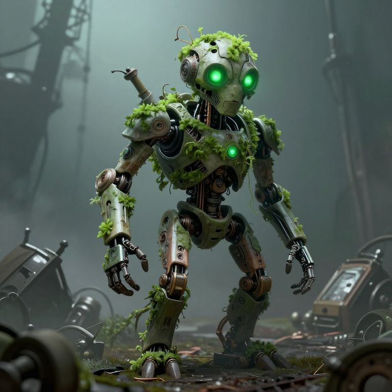 Sprigtrap depicted as a corrupted animatronic with sprouting greenery, glowing emerald eyes, intricate mechanical and organic hybrid design, standing in a foggy, desolate environment with broken machinery scattered around, atmospheric moody lighting, detailed and textured