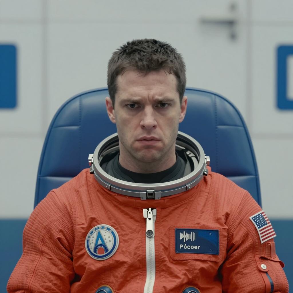 A man with short dark hair, wearing a red astronaut suit with a black neck ring, sits in a blue, quilted headrest. His expression is tense and slightly anxious. The background features white, panel-like walls with blue markings. The man's suit has an American flag patch on his right shoulder. He is centrally positioned, facing slightly to the right.