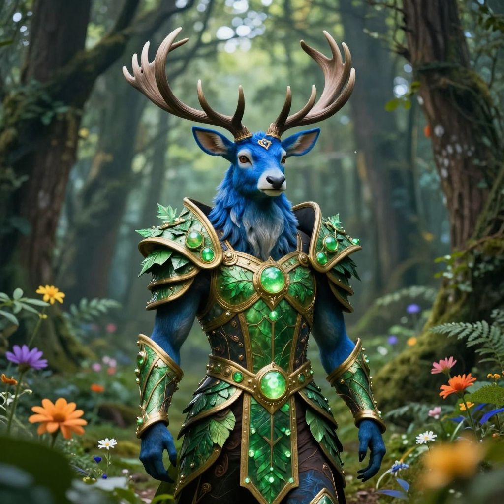 A powerful anthropomorphic forest guardian with the head of a blue stag and large antlers, standing in a mystical forest. The creature wears ornate green and gold armor adorned with leaf motifs and glowing orbs, exuding a majestic and magical presence. Vibrant flowers and lush foliage surround the guardian, enhancing the enchanting and serene atmosphere of the fantasy woodland.