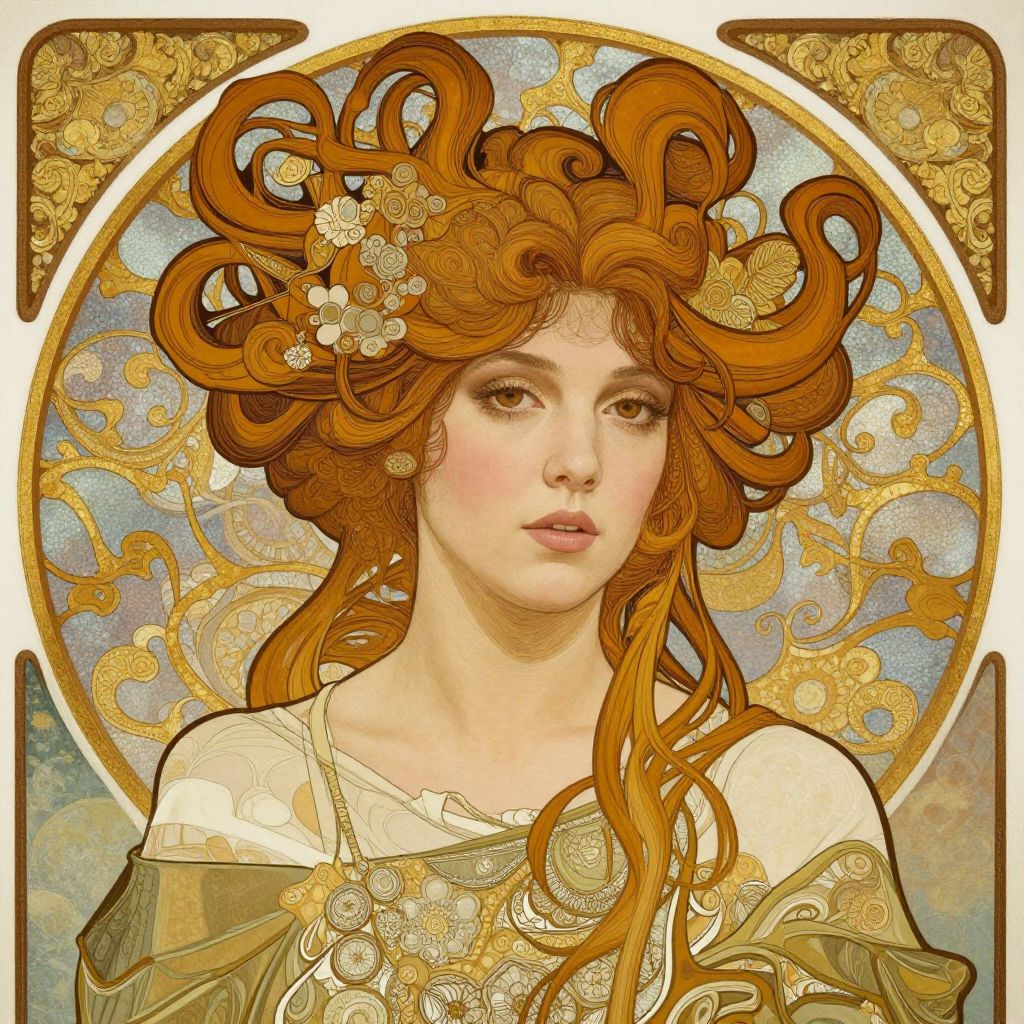 A woman with intricate, swirling hair in a style reminiscent of Art Nouveau, surrounded by ornate, golden patterns.