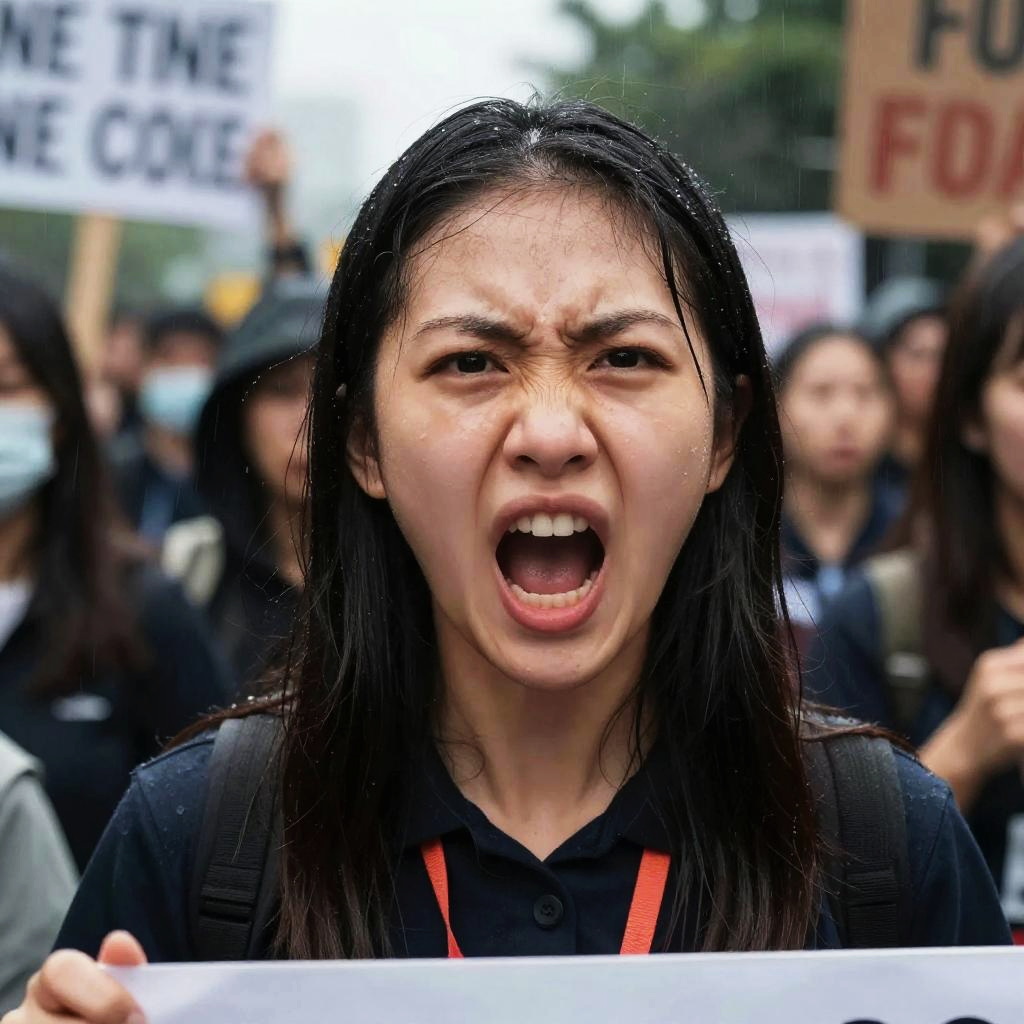 Chinese women, realistic Documentary photography, A young female activist shouting angrily directly into the camera at a protest. Rain pouring down their face distorts their features, conveying outrage and passion. The diffuse natural light heightens the raw, emotional impact., Negative prompt: (worst quality, low quality, cgi, bad eye, worst eye, illustration, cartoon), deformed, distorted, disfigured, poorly drawn, bad anatomy, wrong anatomy, open mouth, nsfw