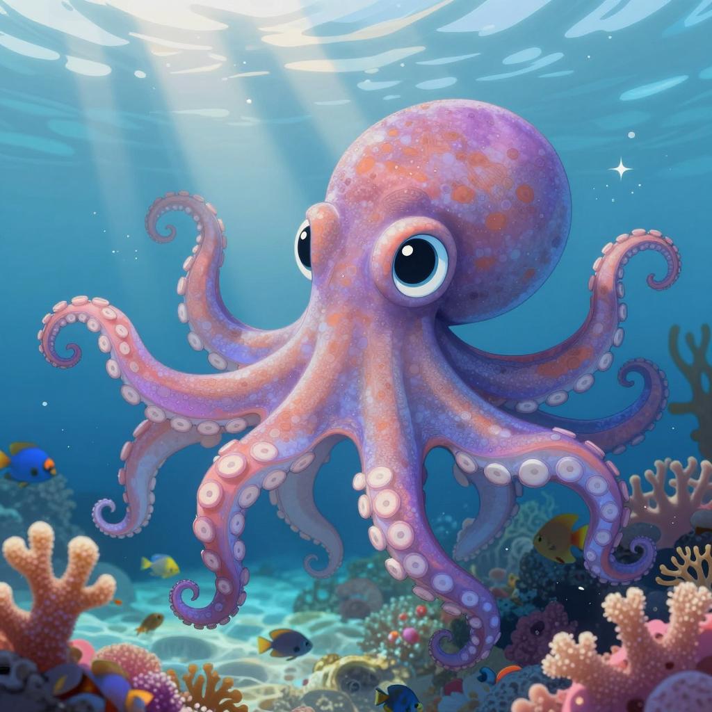 Fashionable A round cute octopus with eight long and slender arms, big round eyes, and a friendly smile. Its body is soft and squishy, with a mixture of purple, pink, and white colors. The octopus is swimming in a coral reef with vibrant colors and exotic fish and plants. The water is crystal clear, and the sunlight shines through the surface, creating a beautiful pattern of light on the reef. The scene is magical and enchanting, with a dreamlike quality and a sense of wonder. The octopus looks playful and curious, exploring the beauty of the underwater world. A digital illustration created with a tablet and a stylus, using vibrant colors and intricate details to capture the beauty of the coral reef and the octopuss movement. The illustration has a whimsical and playful feel, with a touch of fantasy.,