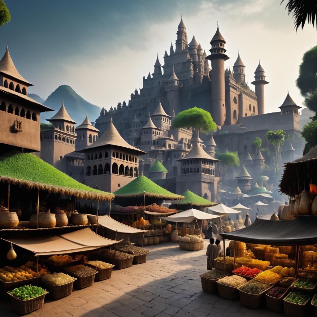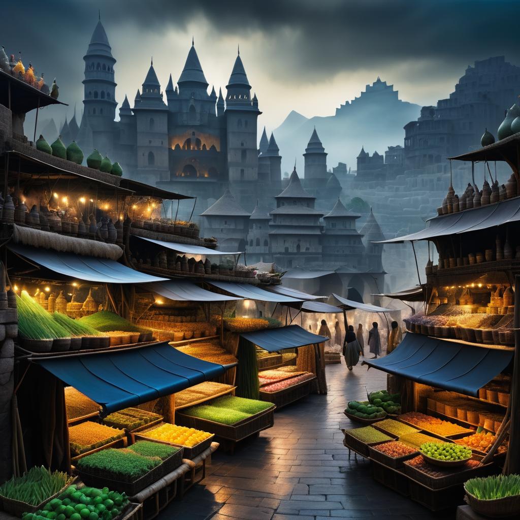 A bustling ancient marketplace set against the backdrop of a large, dark fairy-tale castle with numerous towers and spires. The market is lively with vendor stalls selling various colorful spices or goods in baskets. The scene has a mythical and dreamlike atmosphere, featuring castle architecture that appears inspired by fantasy elements, surrounded by mist and greenery.