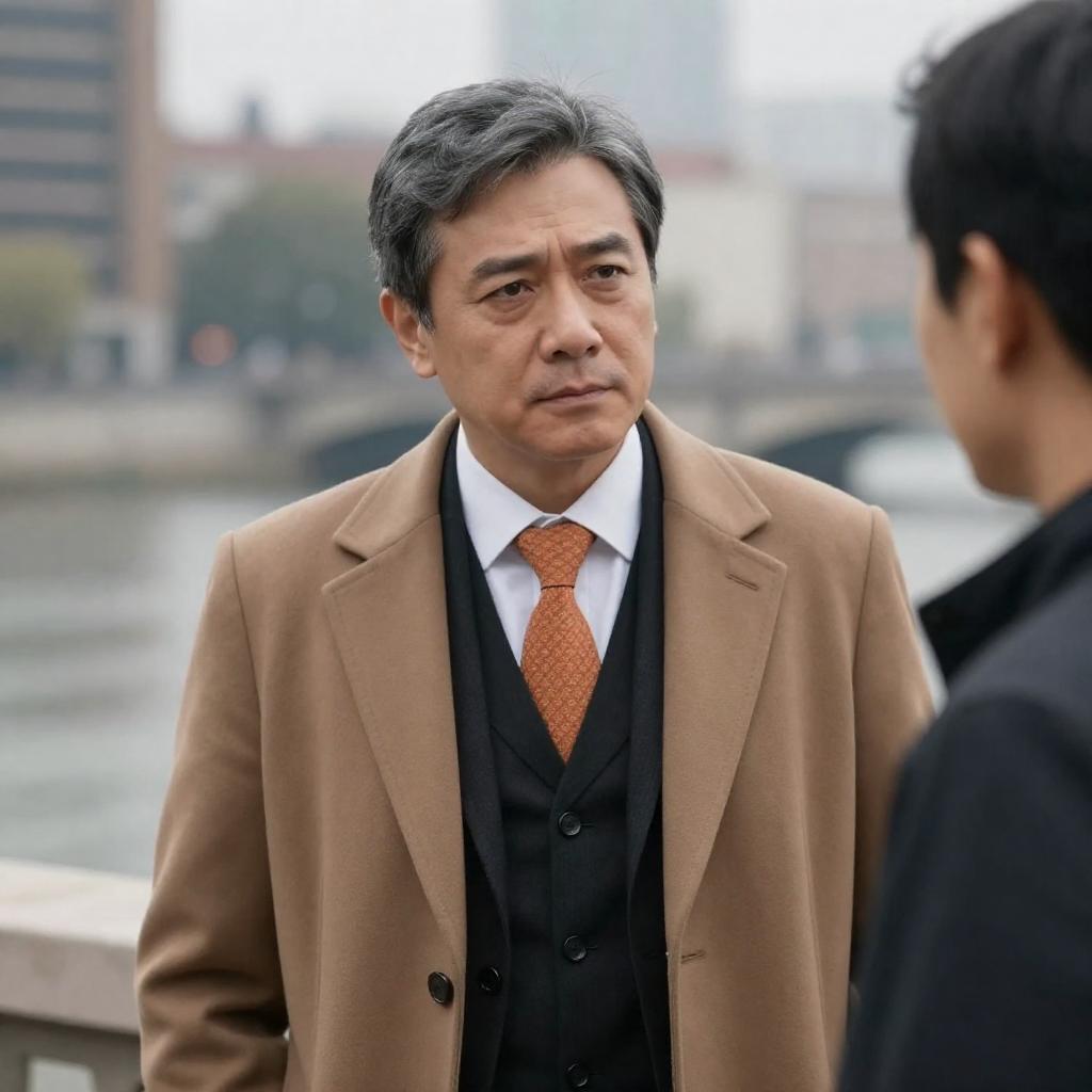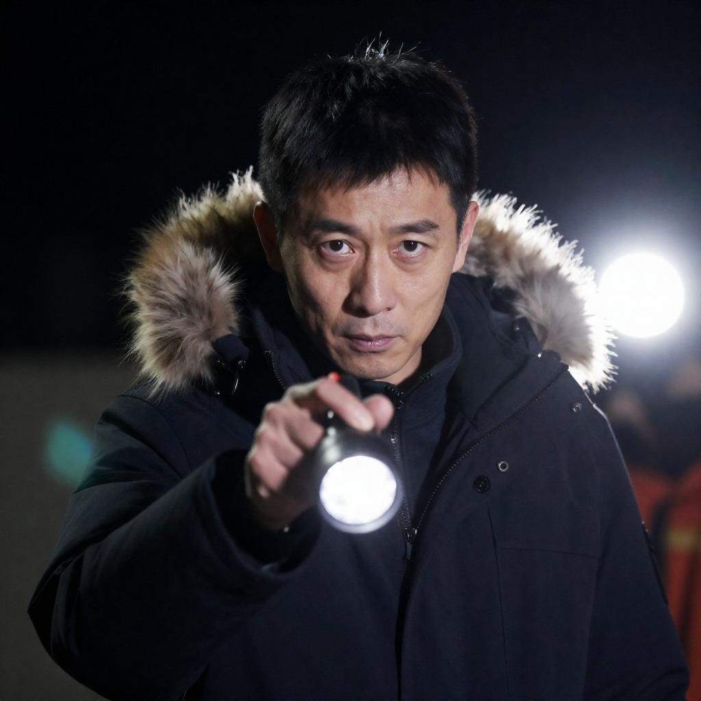 Middle-aged Asian man with a serious expression, wearing a black beret, coat, and gloves, holding a gun, snow falling around him, urban background with warm lights. Snowflakes visible, right hand raised, left hand carrying a bag.