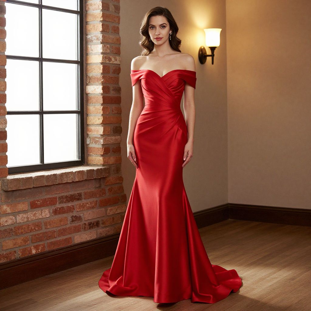Photograph of a slender, fair-skinned woman with dark, wavy hair standing in an elegant room. She wears a stunning, off-the-shoulder, form-fitting red satin gown with a sweetheart neckline and a slight train. The room has beige walls, a black-framed window to her left, and a wall-mounted lamp with a white shade to her right. The wooden floor adds a warm contrast to her vibrant dress. Her confident stance and subtle smile exude grace and sophistication. The lighting highlights the satin's sheen and her gown's elegant drape.