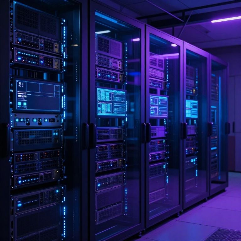 A dimly lit high-tech Serverraum, illuminated by soft blue and purple neon lights, transparent glass walls revealing densely packed servers, advanced hardware components, digital screens displaying system status, ultra-modern and sci-fi inspired