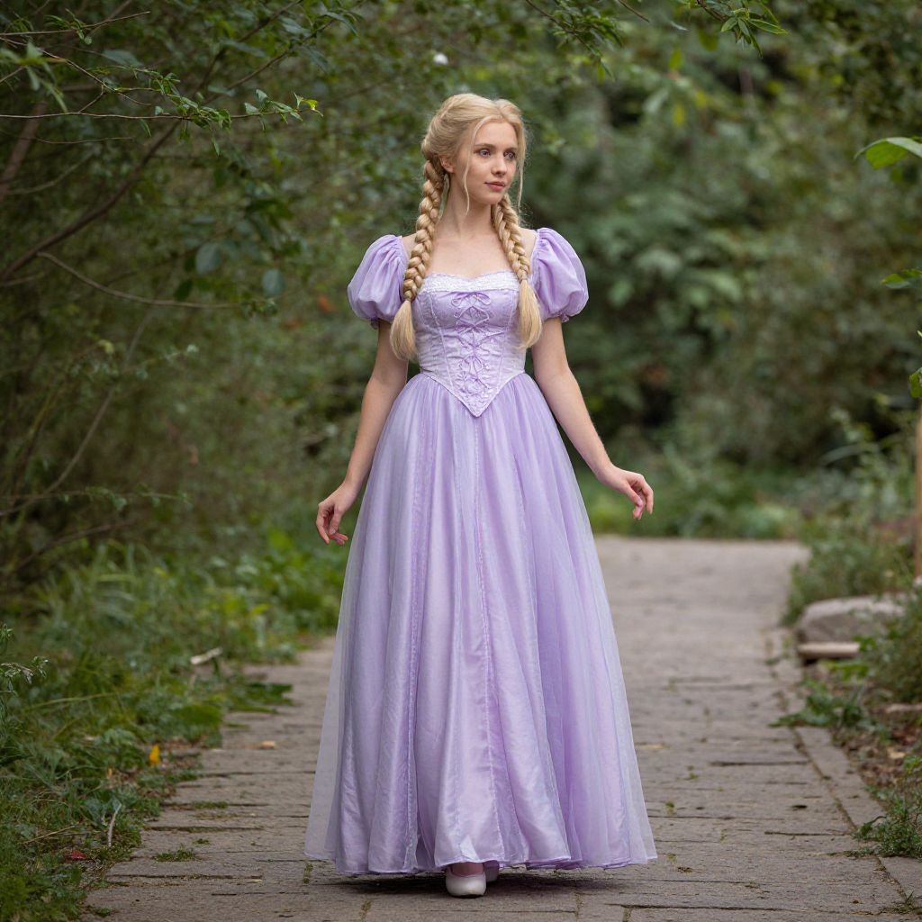 A woman dressed in a flowing lavender gown with puffed sleeves and intricate bodice details stands gracefully on a stone path surrounded by lush greenery. Her long blonde hair is styled in two braids, and the soft natural light creates a dreamy, enchanting atmosphere.