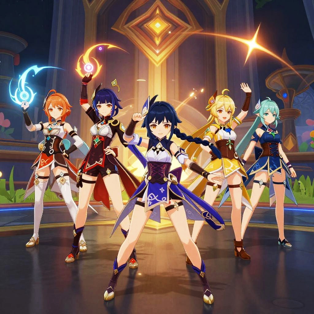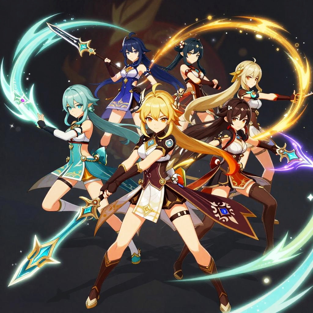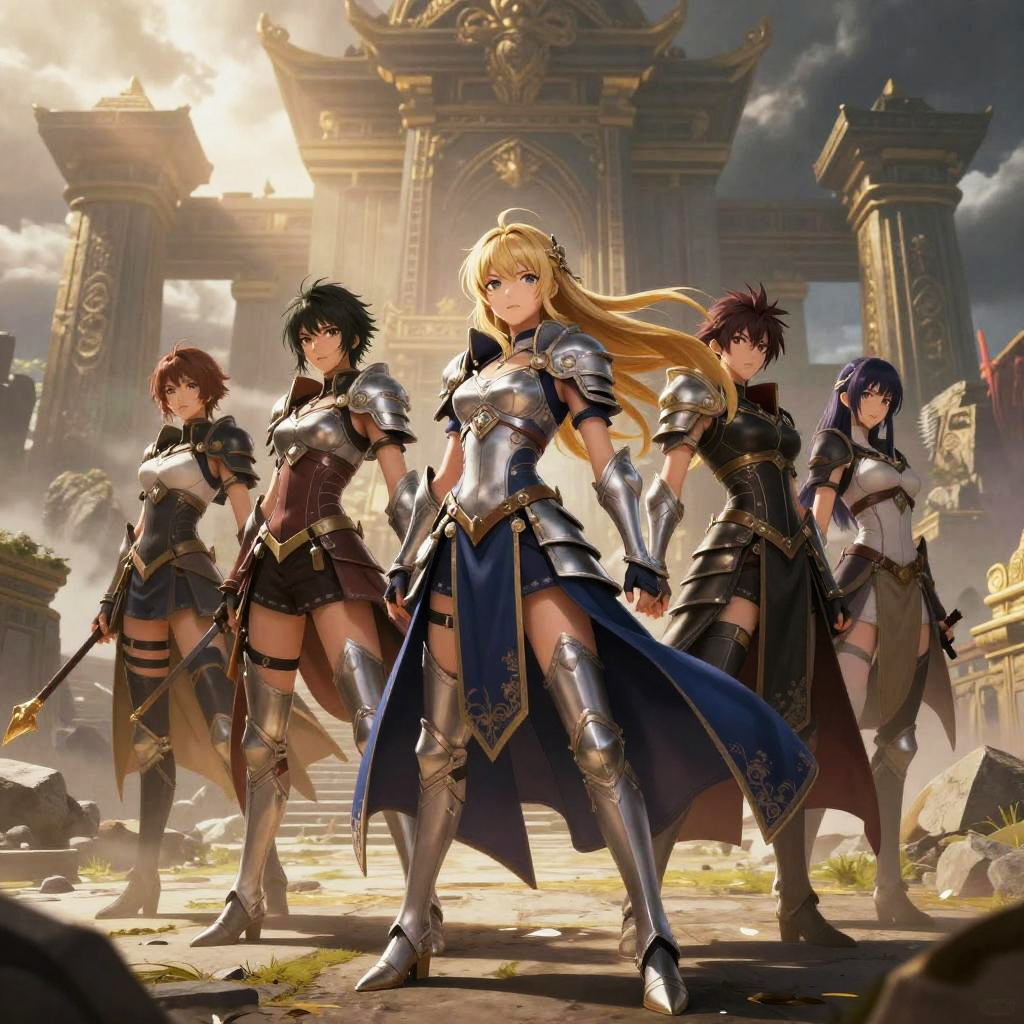 Female anime video game characters equipped with fantasy armor and magical weapons, lush enchanted forest setting, glowing effects, intricate costume design, vivid color palette, dynamic lighting