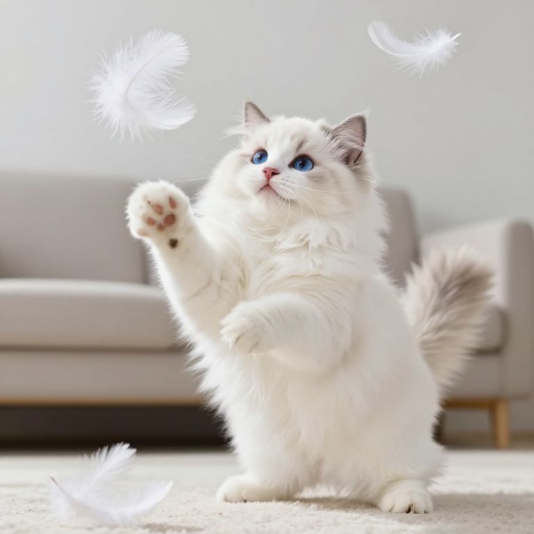Fluffy white ragdoll cat playfully pawing at floating feathers in a bright minimalist living room, stunningly soft fur and lifelike blue eyes, dynamic and whimsical moment, high resolution