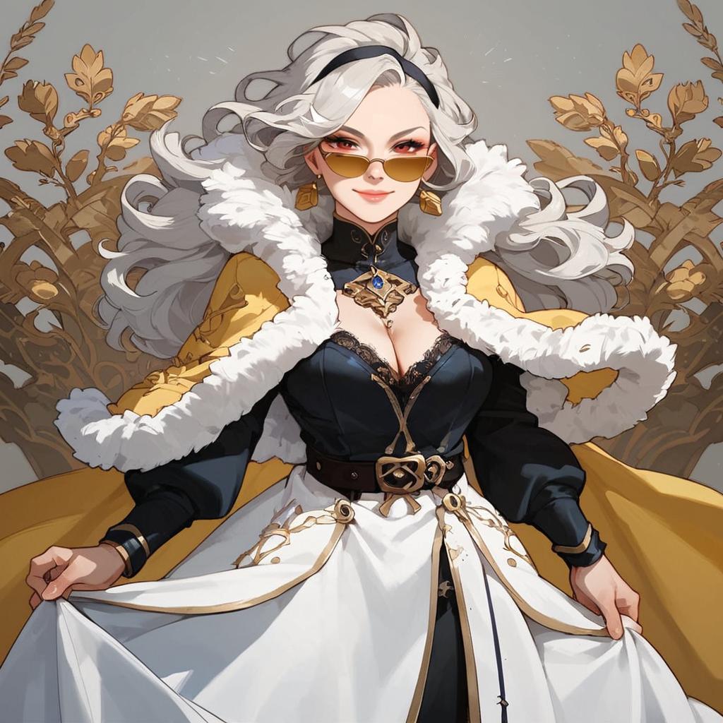 Score_9, score_8_up, score_7_up, score_6_up, score_5_up, score_4_up, , cowboy shot, 1girl, solo, source_anime, sexy pose, smirk, (90s anime style), LNPD-tvs, yellow trim, headband, a woman in a sheered black lace robe, dress, fur trim, pantyhose, embroidery, belt, sunglasses