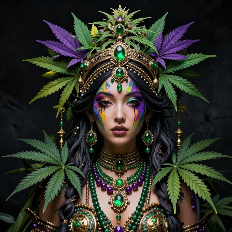 A neo-baroque style character design featuring a goddess of cannabis with intricate, colorful, and detailed marijuana-themed attire and accessories, set against a dramatic, atmospheric, and noise-textured black background.