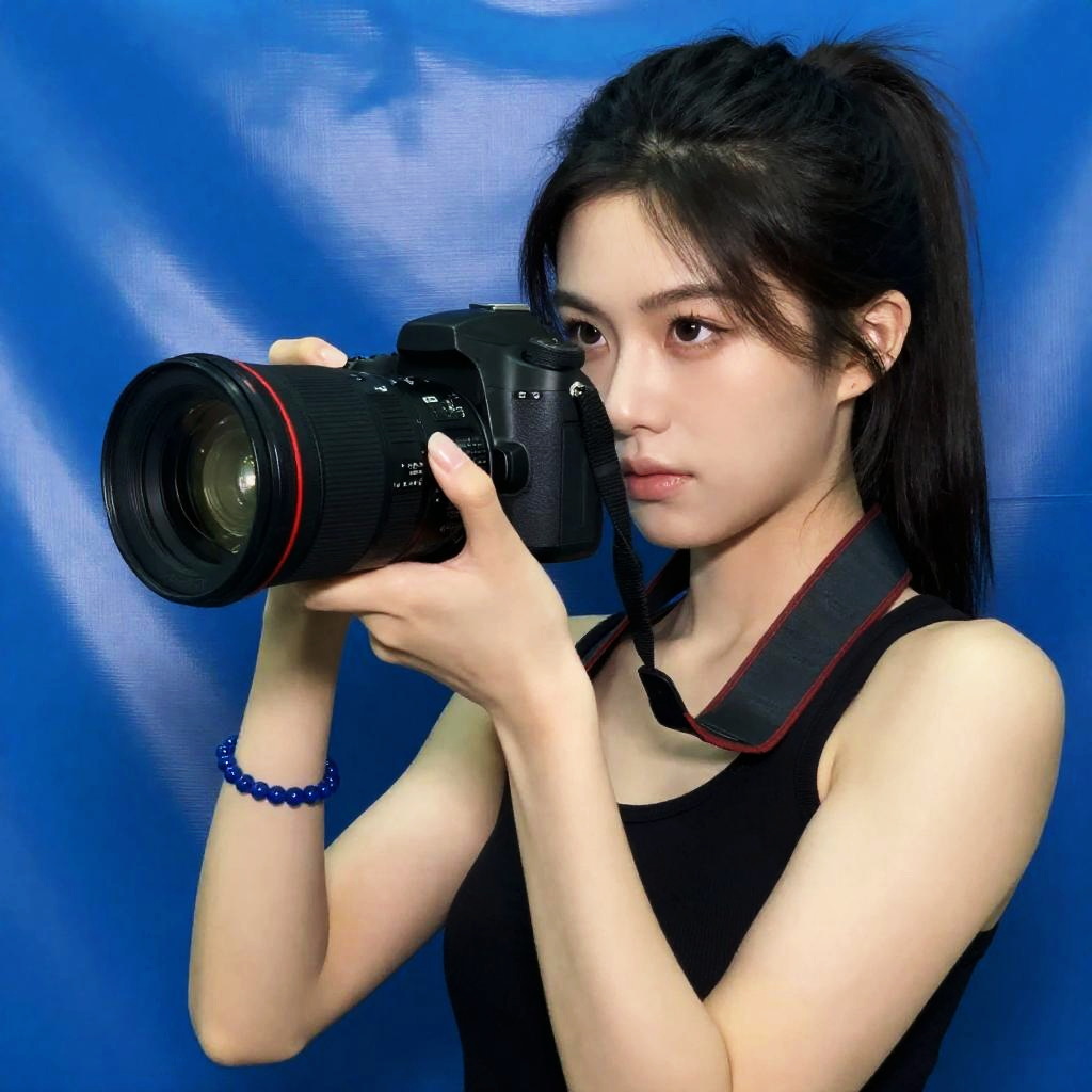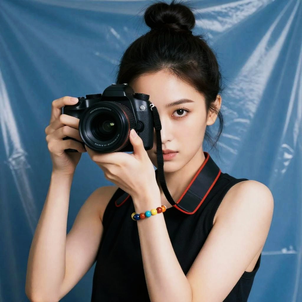 Photograph of a woman with dark hair in a high bun, holding a black DSLR camera to her face, wearing a black sleeveless shirt and colorful beaded bracelets. She has intense, focused facial expression. Background has crinkled blue plastic.