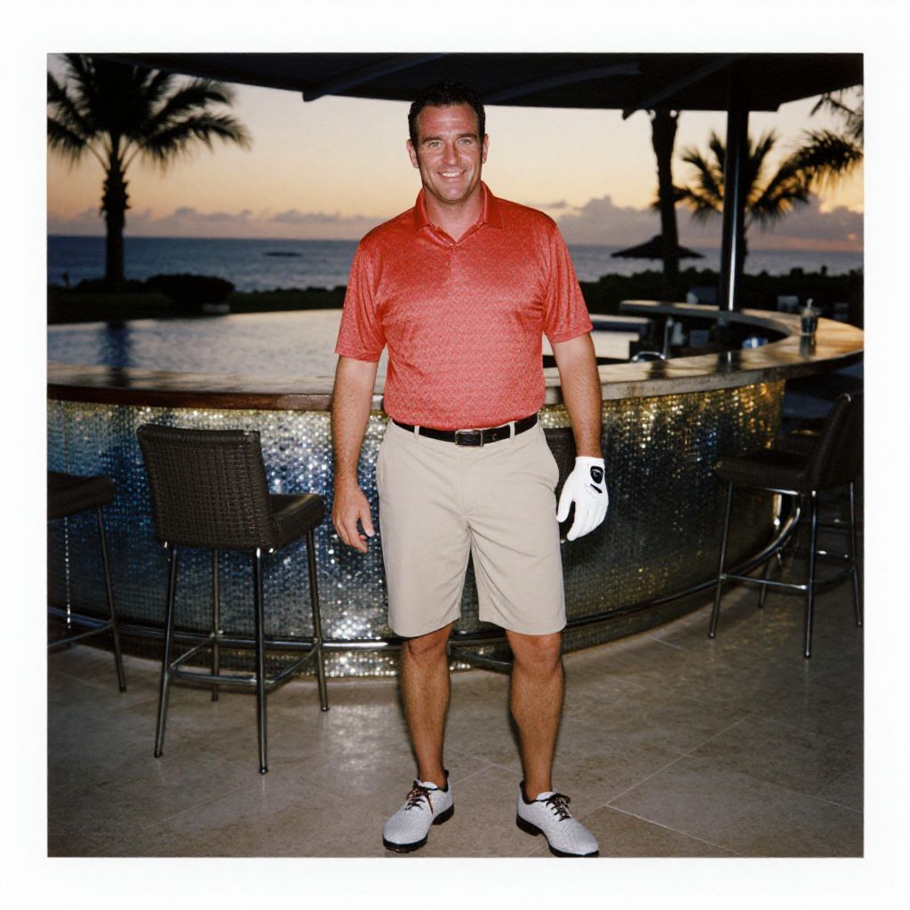 Photograph of a smiling man in a red polo, beige shorts, white sneakers, and golf glove, standing at a tropical bar with sunset and palm