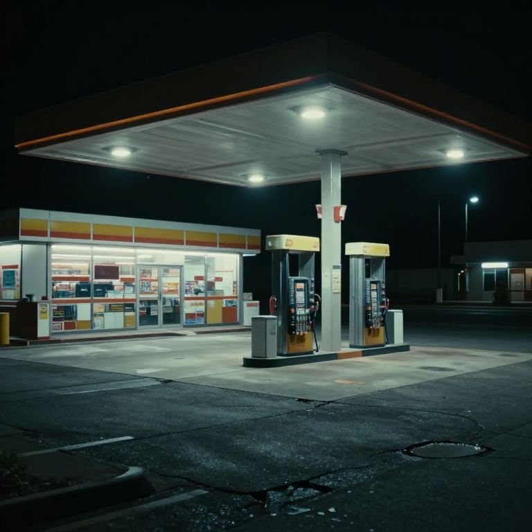 Empty gas station at night with an abandoned convenience store, cracked pavement, and flickering overhead bulbs, lonely and desolate feeling, cinematic noir style with deep shadows and cool color palette.