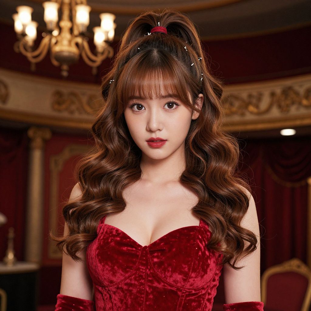 Photograph of an East Asian woman with long, wavy brown hair in a high ponytail, wearing a velvet, strapless red dress that accentuates her medium-sized breasts. She has fair skin, red lipstick, and black eyeliner, giving her a classic, elegant look. She also wears red, velvet elbow-length gloves. The background features an opulent, ornate room with rich, red drapes, gold accents, and a chandelier with glowing bulbs. The image has a romantic, vintage feel, reminiscent of a fairy tale or classic movie. The woman's expression is neutral, with a slight, confident gaze.