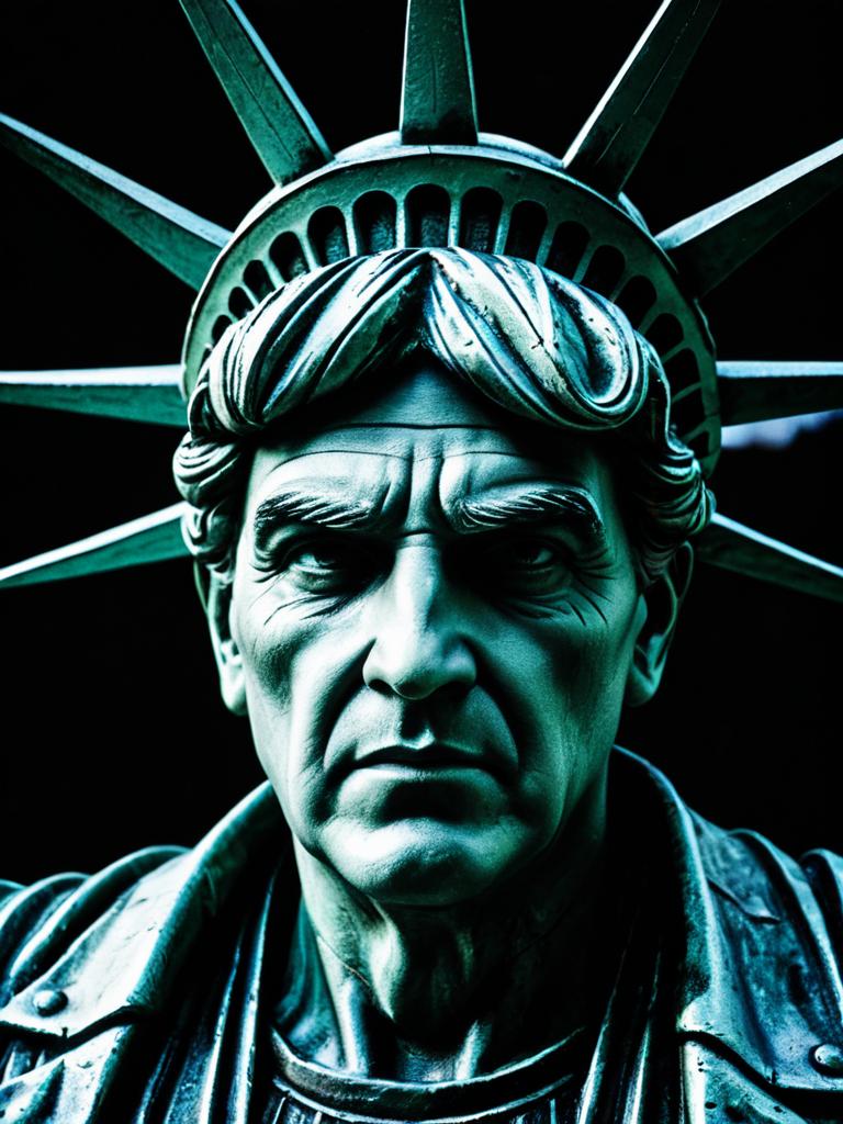 Photorealistic close-up headshot of a man wearing a Statue of Liberty costume, featuring the iconic spiked crown and detailed robes. Dramatic lighting highlights the facial features and textured costume, creating a strong contrast with the dark background.