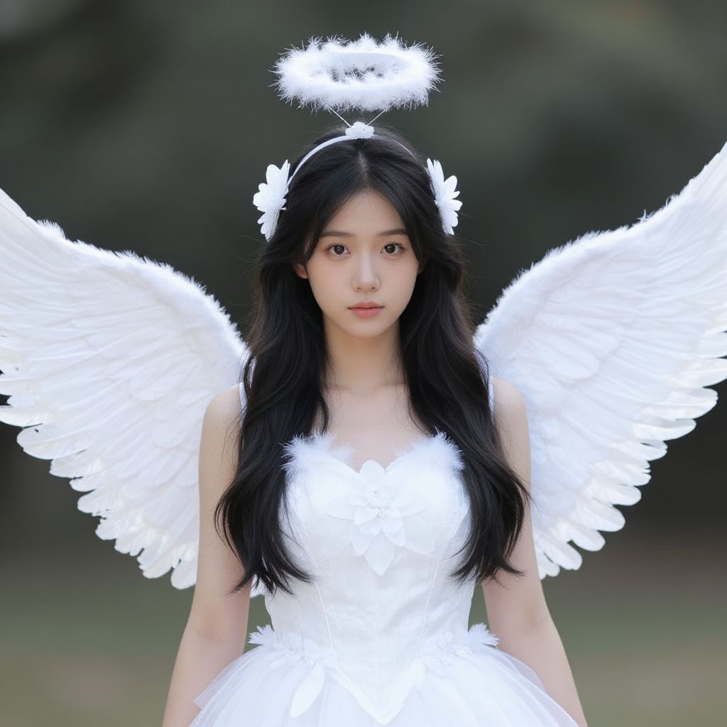 Fallen angel costume girl, 1girl, solo, wings, angel, halo, angel wings, blurry background, looking at viewer, hair ornament, blurry, long hair, dress, flower, feathered wings, hair flower, black hair, white wings, upper body, realistic