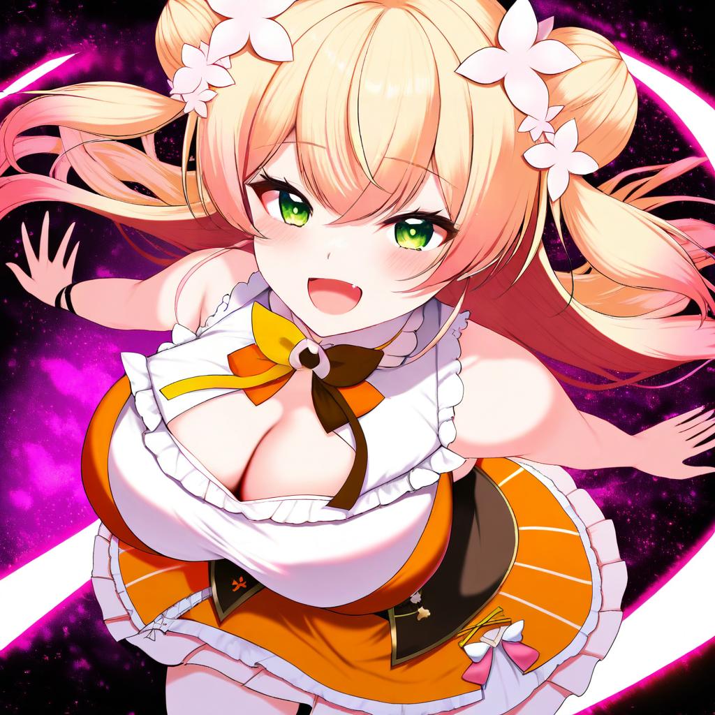 Momosuzu nene (1st costume), hololive, 1girl, fang, green eyes, hair between eyes, blonde hair, long hair, gradient hair, pink hair, two side up, double bun, hair flower, large breasts, medium breasts, cleavage, cleavage cutout, cutout above navel, frilled shirt, orange shirt, orange skirt, frilled skirt, sleeveless shirt, multicolored bow, brown bowtie, orange bowtie, yellow bowtie, multicolored bowtie, bare shoulders, virtual youtuber, virtual youtuber, underbust, corset, by artist okuri banto, animagine