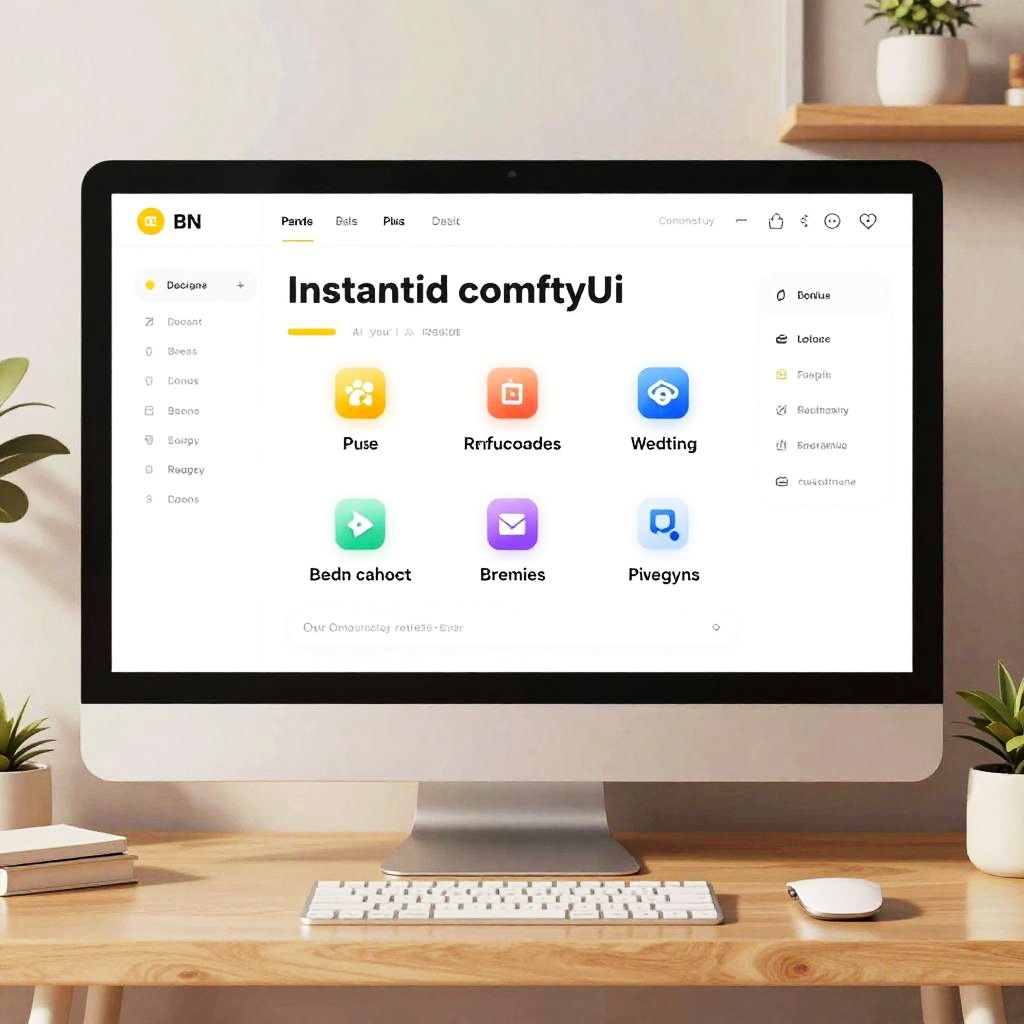 Render of instantid comfyui environment showing a cozy, modern UI for AI generation models, soft color tones, clean interface with intuitive iconography, gentle light effects, futuristic workstation with smart devices and warm lighting