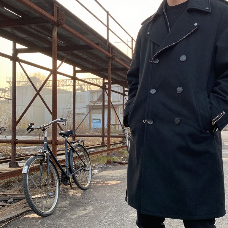 Photograph of a person in a black double-breasted coat standing beside a bicycle under an industrial metal structure with a cloudy sky.