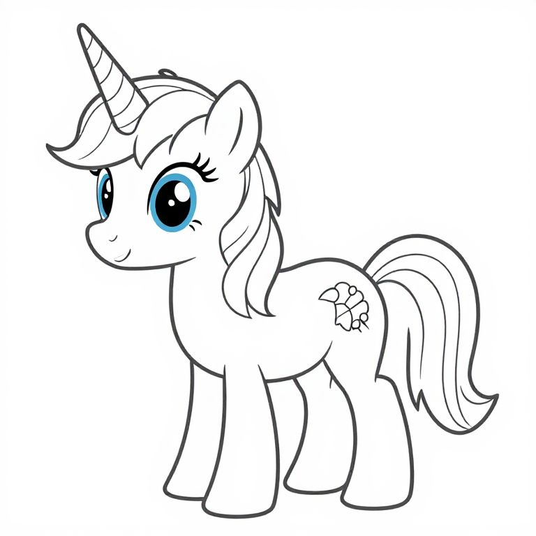This is a digital drawing of a cute, cartoon-style unicorn pony. The pony has large, expressive blue eyes, a white coat, and a light-colored mane and tail. It has a spiraled horn on its forehead and a cutie mark on its flank resembling a star with three smaller stars around it. The pony stands on all four legs, facing slightly to the left, with a gentle smile. The lines are bold and black, and the background is plain white, emphasizing the pony's features. The overall style is reminiscent of children's animated shows, with a focus on simplicity and cuteness.