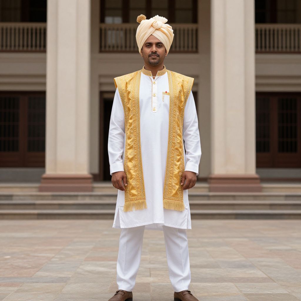 Photograph of a South Asian man standing outdoors in front of a building with large columns and dark windows. He has a medium-dark skin tone, black beard, and wears a white traditional kurta paired with white trousers. His outfit is accessorized with a golden, intricately patterned vest and a beige turban with a small decorative element on top. He has a serious expression and stands with his hands by his sides. The stone ground beneath him is multicolored, and the background features a grand, classical architectural style.