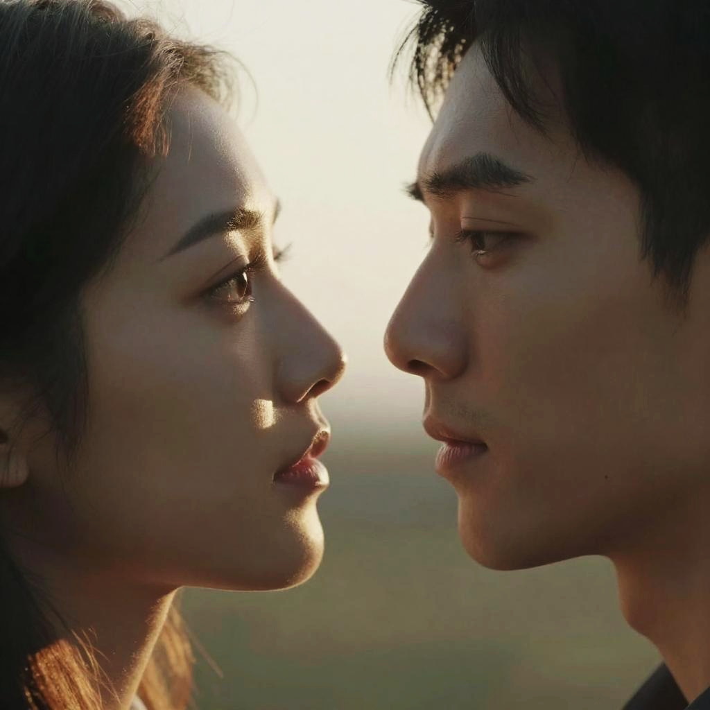 Sensual eye contact in a romantic setting, golden hour lighting, detailed facial features, expressive eyes, soft shadows highlighting the tension and desire between the subjects.